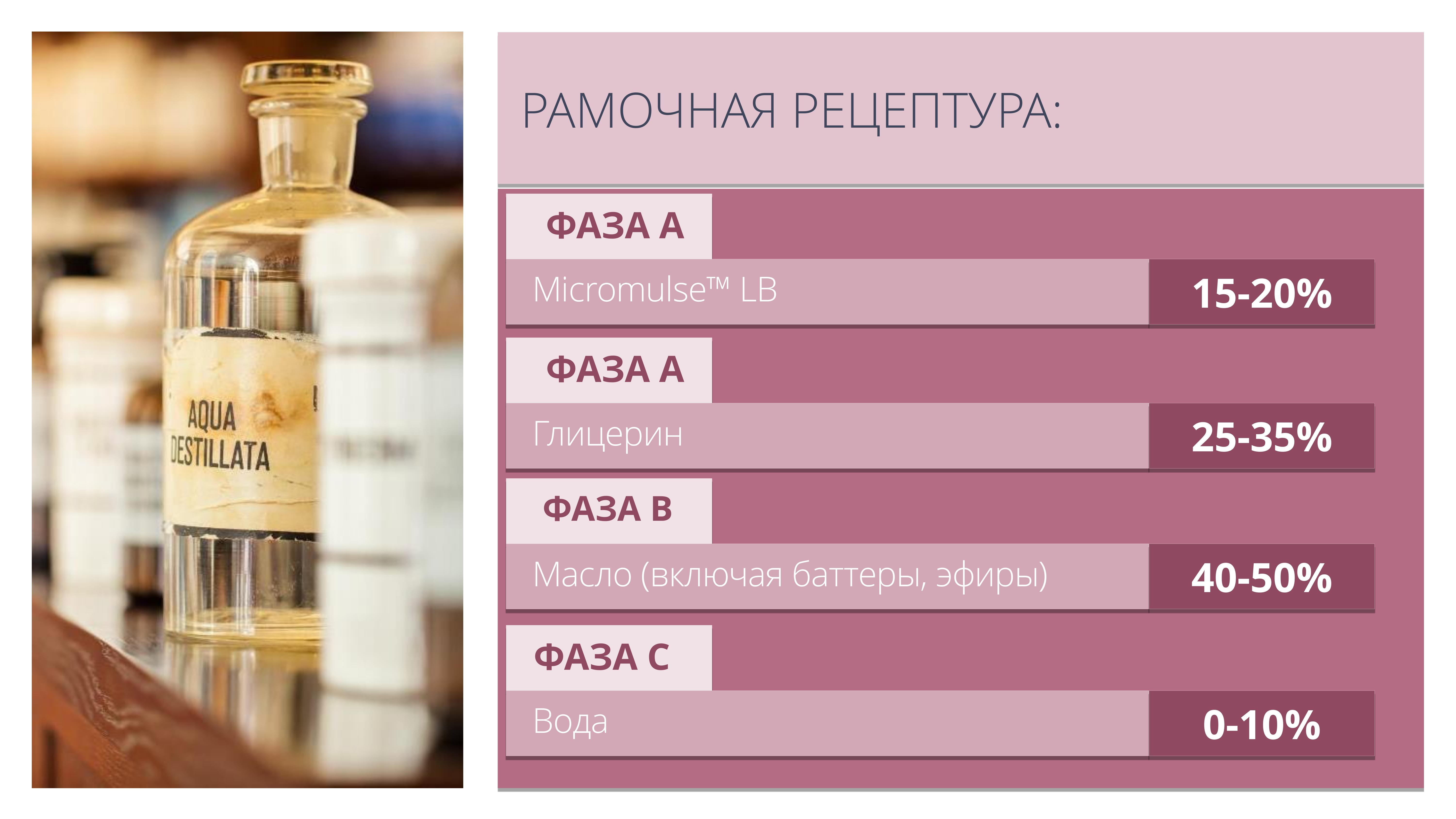 Позволяет создавать ультра актуальные прозрачные мицеллярные масла для очищения кожи и снятия макияжа, продукты для купания («молочные ванны»), гидрофильные масла для душа.